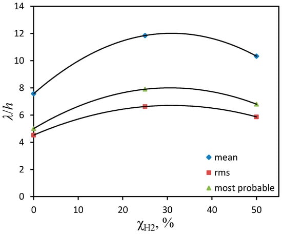 Average properties of cells over the whole flame propagation period (mean, root mean square, the most probable cell size) for different contents of hydrogen in a methane–hydrogen mixture. Lines are the polynomial approximations.