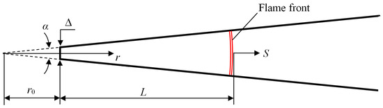 It is convenient to consider the propagating flame in the coordinate system originating at the intersection point of the side wall extension (virtual origin), located at a distance behind the narrow channel end; the current distance passed by the flame from the narrow end is denoted by .