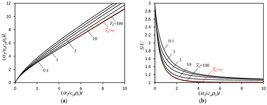 In the intermediate cases of comparable and , numerical solutions to the integral Equation (11) were obtained by an iterative procedure. The results obtained for the expansion ratio , relevant to hydrogen-enriched methane flames, are presented in Figure 13. For reference, the limiting case of is also plotted, illustrating the differences between the flame propagation in diverging and rectilinear channels.