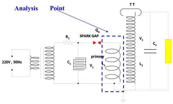 8]. A Tesla coil is an oscillator tuned with a capacitor that drives an air-core resonant transformer to generate a high voltage at a low current. The high-voltage transformer increases the voltage to a level sufficient to jump across the spark gap, which acts as a switch in the primary circuit, thereby producing high voltage in the secondary circuit [
