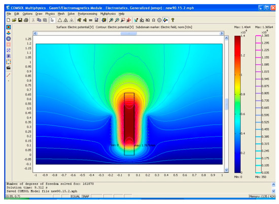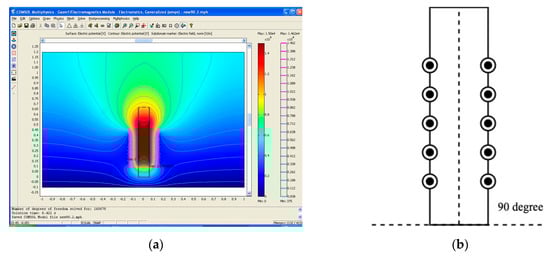 The model of the electricity field at the primary voltage coil at a 90-degree angle: (a) in the case of the FEMLAB program and (b) in the case of the model.