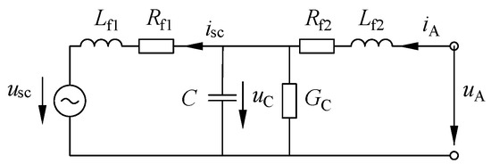 If a conductance is arranged parallel to the central capacitor for resonance damping and should not be neglected, the electric circuit diagram of the inverter with LCL filter is created as shown in Figure 3.