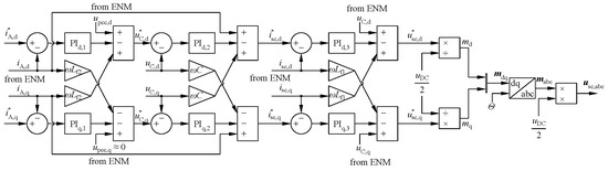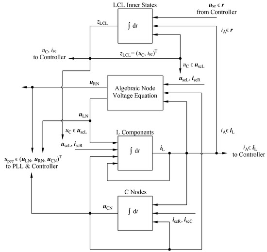 Since the LCL filter is an L component, its terminal current can be extracted as a part of . It is fed into the current controller as the controlled variable, but also states a part of to be put into the ‘LCL Inner States’ box representing the IDES in Equation (19) for the LCL filter. Another necessary input of this box is the inverter source voltage , which results from the control loop. The pcc voltage can be extracted out of one of the node voltage vectors , , or . It is needed for the PLL as well as for the current control loops as the disturbance input. The output of the ‘LCL Inner States’ box is the vector containing the inner capacitor voltage and the source current . is extracted to be put into , which is needed as an input for the boxes ‘Algebraic Node Voltage Equation Voltage’ and ‘L components’.