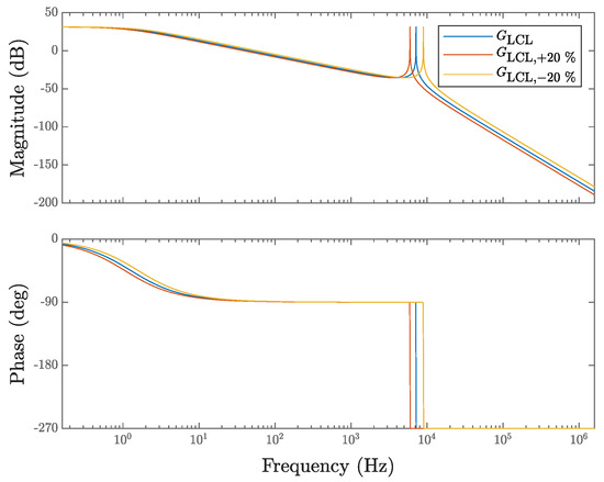 According to the mentioned LCL filter design requirements in Section 2.2.1, one sample filter design is given in Table 2 that meets the requirements for the switching frequency kHz. It will be used for the following study cases. In this case, the controller parameters are designed for a fast response. A damping resistor is neglected; i.e., the following results are based on the basic LCL model from Section 2.3.1. The resulting Bode diagram of this filter design is pictured in Figure 8. The transfer function for the design selected here is plotted with the exact values from Table 2 as well as with 20% deviating values for , and C in order to take the component tolerances into account. For the configuration selected here, the distance of the resonance frequency to the cutoff frequencies kHz and kHz is maintained.