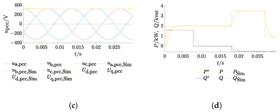 To ensure that the ENM with the developed inverter component and subordinate control loop developed here can be used for transient grid calculations, its accuracy and reliability must be verified. For this purpose, various study cases of inverters connected to a European low-voltage grid ( V, Hz) are considered. Firstly, the filter design selected here is presented. Subsequently, grid calculations are carried out with the ENM using the DAE given by Equations (3)–(5) and the established tool Simulink/Simscape as comparison software. Thus, the same grid configurations are set up once in our own tool according to the ENM’s component and node definitions (cf. Section 2.5) and once in Simulink (Matlab R2024b) using the Simscape ‘Specialized Power Systems’ library [50]. The inverter control loops are also set up in the same way according to Figure 5, realized by interconnecting single blocks available in Simulink. To focus on the inverter component, transients are generated by changing the power references and as an ideal step function, while the loads are kept constant. This work does not take into account how the power references and are derived, but specific methods can also be easily supplemented here. They could, for example, be the result of maximum power point tracking of PV systems or result from economic optimization for the operation of electrochemical components or batteries or from grid code requirements. Both results will be compared in the following sections. The ENM results will be displayed with a solid line and not specially marked. Simulink results will be shown with a dashed line and marked with ‘Sim’ in the index. Further discussion on the results and the presented method will be given in Section 3.4.