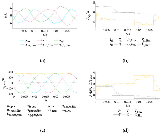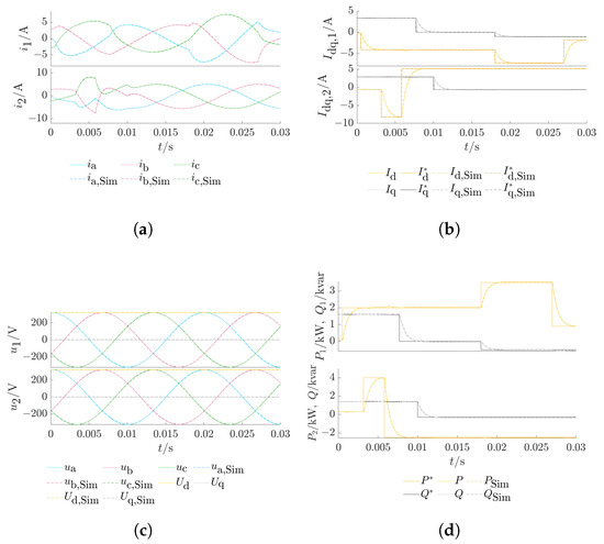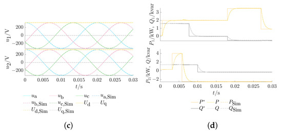 In the results, the presentation of all individual node voltages and component currents will be omitted. Instead, the focus will be on the inverters and their pcc. The main results—the terminal currents and , the pcc voltages and , and the power results P and Q—are displayed in Figure 15 with inverter 1 on the top and inverter 2 on the bottom of each figure for study case 1. In addition, further detailed results for values inside the LCL filter that are decisive for the cascaded control approach are also presented in Figure 16. In particular, it shows the phase-source currents and as well as the capacitor voltages and the modulating signal as results of the control loops. Accordingly, the same results for study case 2 are shown in Figure 17 and Figure 18. All results are again compared to Simulink.