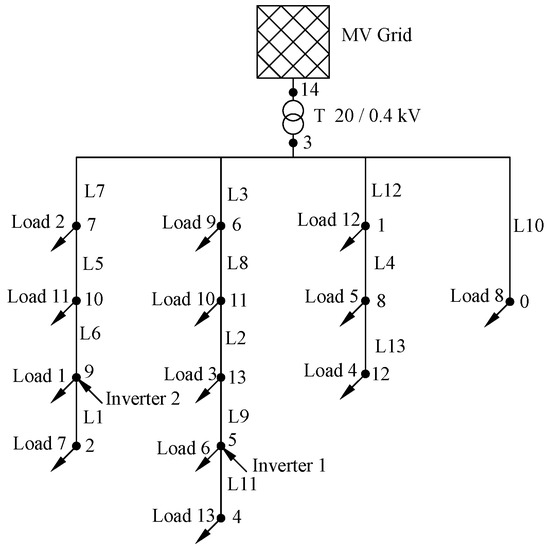 The resistive–inductive loads are each modeled as LR series impedances resulting from , and . The capacitive loads are modeled as CR parallel circuits and their values are determined by and . With T electric circuit diagrams for the lines, inductive loads, and also the LCL inverters as L components, the network only consists of L components for study case 1. Since there are no components of type R or C, no R or C nodes occur and each of the node voltages will be a part of in this case. Therefore, the parts and and their specific matrix entries can be removed from Equations (3) and (4). Also, the DES in Equation (4) is reduced to the first row solving for the inductive currents . In contrast, regarding study case 2, here C components also occur with the three capacitive loads 1, 6, and 11. Thereby, the nodes 5, 9, and 10 are now classified as C nodes by definition, and are hence also nodes to which the two inverters are connected. Therefore, the pcc voltages are part of and are a result of the DES in Equation (4). The full method’s DAE is only reduced by the parts relating to and for study case 2. In order to make the study cases comparable despite the different load situation, the operation modes of the inverters are set to be the same. Inverter 1 is controlled according to the power setpoints in the first example (cf. (34)). The second inverter setpoints are chosen as follows:
