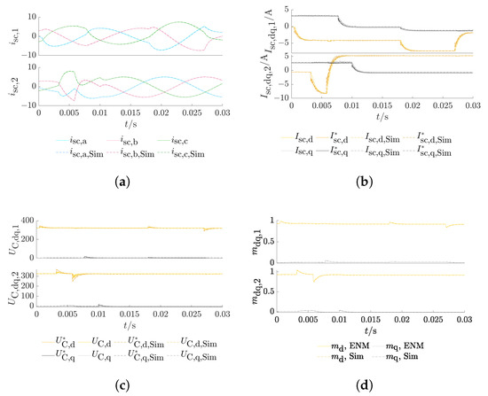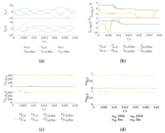 The phase currents and voltages of the two inverters in Figure 15a,c for study case 1 as well as in Figure 17a,c for study case 2 show very good accordance between the ENM and Simulink. The pcc voltages in Figure 15c for study case 1 are the result of the AES in Equation (3), whereas for study case 2, the pcc voltages are obtained from the DES in Equation (4), since the pcc nodes are C nodes. The good agreement can also be confirmed for the source currents in Figure 16a and Figure 18a, which were obtained here from the IDES in Equation (19). The values of the internal control variables and the modulation signals in Figure 16c,d for study case 1 as well as in Figure 18c,d for study case 2 also show that the controllers work the same in the ENM as in Simulink. At the point in time when the setpoint of assumes a negative value, the setpoint component of of the terminal current also changes its sign accordingly. The reference value of the source current also changes its sign, but more smoothly here due to the type of control. The model also works as desired for negative values of . The overall very good agreement between the two tools for the two different study cases with different load parameters and node types suggests that the method developed here provides reliable results for inverter operation.