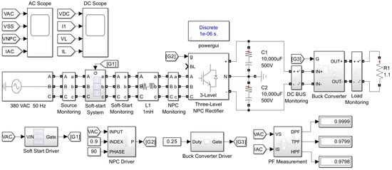 The proposed topology, illustrated in Figure 2, can be broadly categorized into three subgroups. The first subgroup comprises static transfer switches, which address the previously mentioned issues of inrush current and reverse energy flow. The second subgroup consists of the NPC rectifier circuit, responsible for performing the primary rectification process. The third subgroup features the SiC IGBT buck converter circuit, designed to lower the high DC voltage obtained to the desired level.