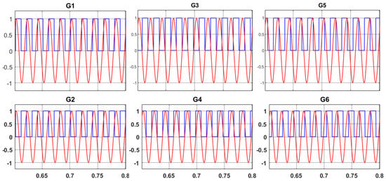 Time-varying gate signals of static switches (Red: voltage across thyristor, blue: gate signal of thyristor).