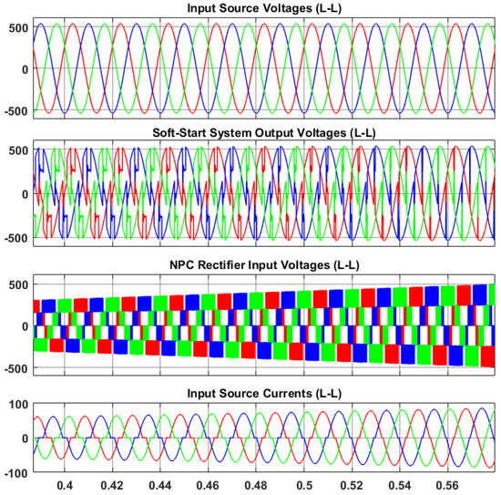 In the simulation circuit illustrated in Figure 6, the system is divided into sub-circuits according to the proposed topology functions to provide a clearer and more comprehensible view. The simulation parameters of the circuit are presented in Table 3. The block labeled “soft starter”, which contains static switches, is depicted in Figure 3.