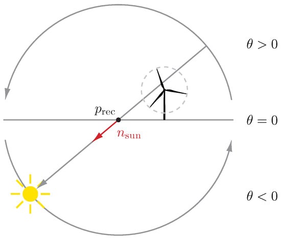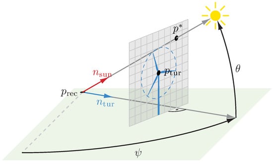 - is the normal vector with the direction that the turbine’s rotor faces at time . In accordance with most regulations, we make the (worst-case) assumption that the turbine is facing the sun. Therefore, is defined by the azimuth angle .