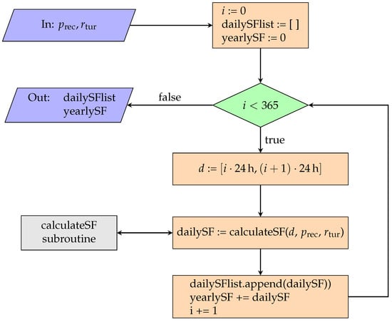 The SF computation method we presented (“calculateSF”) can be used to calculate SF for a whole year through iterating over each day of the year. A flow chart diagram of this procedure is depicted in Figure 5.