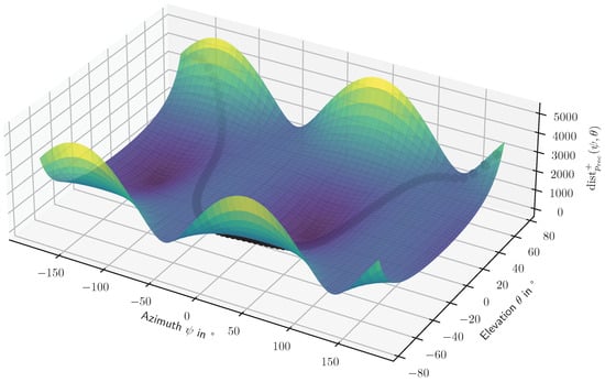 Surface defined by the distance function for and . Each day, the sun follows a path in the azimuth/elevation plane. The azimuth is constantly increasing and ranges from to . The figure further depicts an exemplary, dotted sun path.