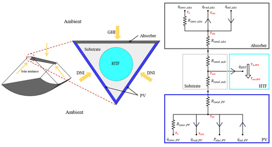 The various modes of heat transfer (conduction, convection, and radiation) that occur between the different elements of the SRC-PVT, which is situated between the environment and the HTF, are represented as thermal resistances. The incident solar irradiance (GHI and DNI) is considered as incoming power. Based on the modes of heat transfer and the incidence of solar irradiance, the energy balance equations of the SRC-PVT are defined.