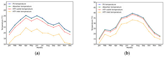 - Figure 3 illustrates the monthly temperatures of the PV, absorber, and HTF at the outlet and inlet. In the case of Cuernavaca, the highest temperatures were recorded in April and the lowest in December. The temperature range throughout the year was 16 °C to 26 °C. The mean temperature gain of the HTF was 3.42 °C. In Mexicali, the highest temperatures were in July and the lowest in January. The temperature range throughout the year was 10 °C to 40 °C. The mean temperature gain of the HTF was 4.19 °C.