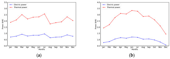 Figure 4. Power per month for the locations of (a) Cuernavaca and (b) Mexicali. - Figure 5 illustrates the electrical and thermal efficiency values on a monthly basis. In the case of Cuernavaca, the highest electrical efficiency was observed in January and December, with a value of 0.199, while the lowest electrical efficiency was recorded in April and June, with a value of 0.197. The highest thermal efficiency was observed in April, with a value of 0.537, while the lowest thermal efficiency was recorded in November, with a value of 0.525. The average electrical efficiency was 0.198, while the average thermal efficiency was 0.531. In the case of Mexicali, the highest electrical efficiency was observed in January, reaching 0.200, while the lowest electrical efficiency was recorded in July, at 0.192. The highest thermal efficiency was observed in June, at 0.534, while the lowest thermal efficiency was observed in December, at 0.505. The average electrical efficiency was 0.196, while the average thermal efficiency was 0.523.
