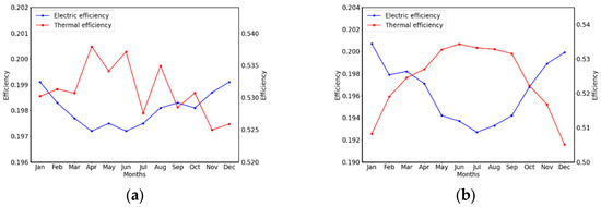Figure 5. Efficiencies per month for the locations of (a) Cuernavaca and (b) Mexicali. - Figure 6 illustrates the values of electrical and thermal energy produced per month. The results were obtained by multiplying the point values of power, estimated by the model, by the number of daylight hours for each month and the number of days in each month [39,40]. In the case of Cuernavaca, the highest amount of energy produced was obtained in July, with a total of 387.93 kWh of electric energy and 1036.11 kWh of thermal energy generated. The lowest amount of energy produced was recorded in February, with a total of 239.38 kWh of electric energy and 641.26 kWh of thermal energy generated. The total energy produced was 3474.64 kWh of electricity and 9321.28 kWh of thermal energy. The average energy produced was 291.99 kWh of electric energy and 784.27 kWh of thermal energy. In the case of Mexicali, the highest amount of energy was produced in July, with a total of 515.16 kWh of electric energy and 1424.39 kWh of thermal energy. The lowest amount of energy produced was in December, at 177.69 kWh of electric energy and 448.88 kWh of thermal energy. The total energy produced was 4367.32 kWh of electric energy and 11,747.89 kWh of thermal energy. The average energy produced was 363.94 kWh of electric energy and 978.99 kWh of thermal energy.