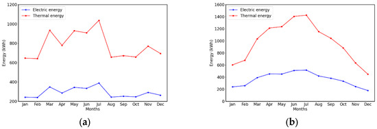 Figure 6. Energy per month for the locations of (a) Cuernavaca and (b) Mexicali.