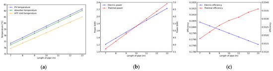 - Figure 7 illustrates the temperature of the PV, absorber, and HTF outlet, as well as the electrical and thermal power and efficiency when varying the parameter of SRC-PVT pipe length. The value of this parameter in the validation is 10 m, which is comparable to the length of commercial receivers typically used in conventional collectors (approximately 8 m). To investigate the impact of varying pipe lengths, a range of +/−3 m was considered, resulting in a range of 7 m to 13 m.