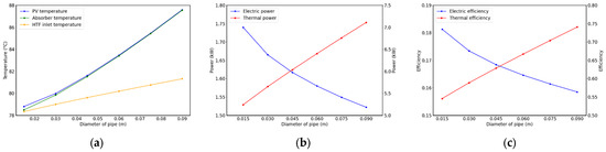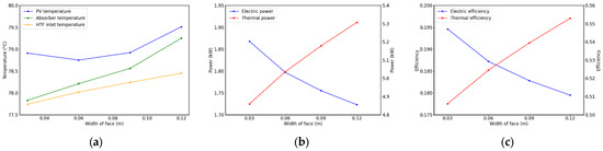 Figure 7. Results when varying the length of the pipe: (a) Temperature, (b) Power, and (c) Efficiency. - Figure 8 illustrates the temperature of the PV, absorber, and HTF outlet, as well as the electrical and thermal power and efficiency when varying the SRC-PVT face width parameter. The value of this parameter in the validation is 6 cm. The solar panels have a width of 3 cm, while the diameter of a conventional SRC glass tube is 12 cm. Therefore, the operating range assigned to this parameter is from 3 cm to 12 cm.