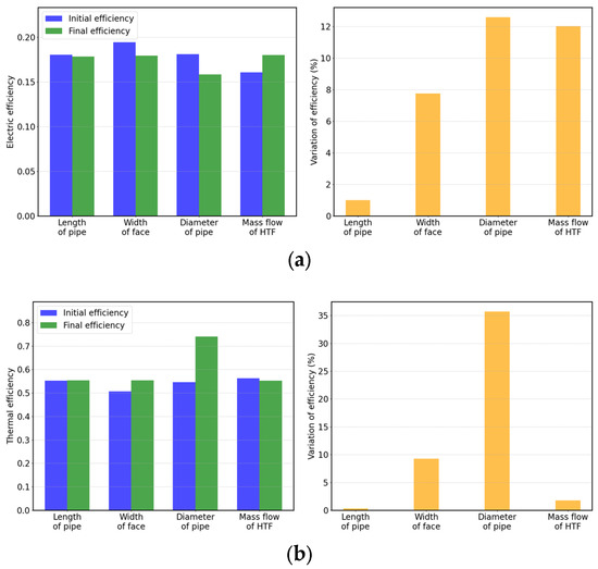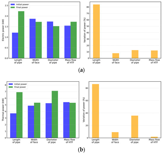 The objective of the parametric study is to analyze the impact of geometric characteristics on the behavior of the model. In light of the findings presented in the works of Calise [28] and Yazdanifard [25], it was deemed appropriate to vary the values of the following parameters: the pipe length inside the SRC-PVT, the width of the SRC-PVT faces, the pipe diameter inside the SRC-PVT, and the HTF mass flow. This last parameter does not correspond to a geometrical characteristic of the SRC-PVT. Nevertheless, in practice, it is a widely used parameter as it allows for the regulation of thermal energy extraction from the system. The variation ranges of the parameters were established by taking into account the dimensions of the model in its validation and the dimensions of commercial receivers (solar panels and conventional solar collector pipes), as presented by Tagle-Salazar.
