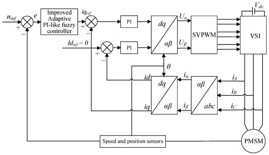 Figure 1 shows the overall structure of the dual closed-loop control system of the PMSM adopted in this paper, and the control process is as follows: firstly, the speed outer loop uses the proposed improved adaptive PI-like fuzzy controller to obtain the reference value iqref of the q-axis current; secondly, the current inner loop adopts the control mode of idref = 0, and the feedback values of id and iq are obtained from the three-phase currents after Clarke and Park transformation. Subsequently, the deviation of id and iq is fed into the improve adaptive PI-like controller, then by inverse Park transformation for the obtained voltage signals, the reference voltages Uα and Uβ in the stationary two-phase coordinate system are obtained. Finally, by SVPWM processing for the reference voltage signals, the switching signals of the inverter is generated to control the PMSM.