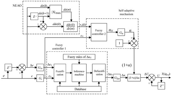 The proposed improved adaptive PI-like fuzzy controller consists of three parts, i.e., fuzzy controller 1, fuzzy controller 2, and NEAO, as shown in Figure 2. The fuzzy controller 1 is a pure PI-like fuzzy controller; its function is similar to the classical incremental PI controller, and it is used to undertake the main control tasks. Fuzzy controller 2 is an auxiliary fuzzy controller whose control role is to adjust the output of fuzzy controller 1 in real time to improve the adaptability of the PMSM system relative to various stages of dynamic response. The NEAO processes the error acceleration using a normalization algorithm to obtain a state information reflecting the speed of system response. The two fuzzy controllers involved both use the structure of dual-input single-output, so only two different sets of fuzzy rules need to be formulated in the design process, which makes the design process relatively simple.