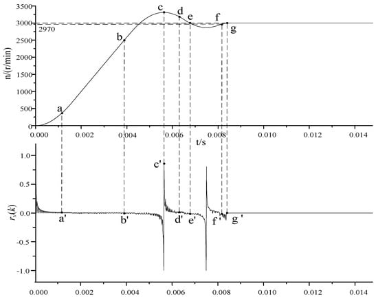 From Equation (19), it can be seen that compared with the traditional PI-like controller, in the d~e stage of system dynamic response (close to the system speed set point), the improved adaptive PI-like fuzzy controller is able to slow down the error change, inhibit the speed fallback, and reduce the oscillations in each sampling cycle of the system.