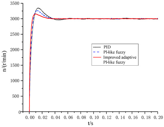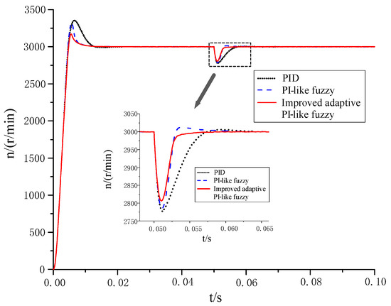The simulation conditions are set as follows: the given speed is 3000 r/min, the simulation time is 0.1 s, and the rated 1.27 N load is applied at t = 0.05 s. Under the same working conditions, Figure 4 shows the dynamic response waveforms of the PMSM system when the improved adaptive PI-like fuzzy controller is used. For the sake of comparison, Figure 4 also shows the comparative waveforms of the control effect of the system using the traditional PID controller and PI-like fuzzy controller. According to the comparative response waveforms in Figure 4, there are the following research results: