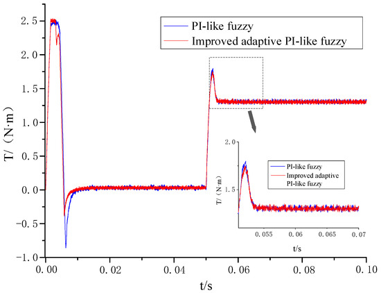 Figure 5 and Figure 6 show the comparison waveforms of the torque response during the dynamic response of the PMSM system, and it can be seen that, compared with the PID controller and the PI-like fuzzy controller, when the improved adaptive PI-like fuzzy controller proposed in this paper is used, the faster torque response can be obtained regardless of whether in the start-up stage of the PMSM system or when the load is added suddenly; the PMSM system can reach the stabilization state more quickly, and then the PMSM system has better stability.