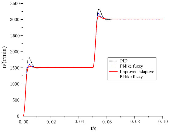 - In the start-up stage of the PMSM system, when the improved adaptive PI-like fuzzy control algorithm is adopted, the overshoot of the system is obviously the smallest, about 5.7%, and the time to steady state is the shortest, about 0.007 s. Compared with the PID control system, the PI-like fuzzy control system has a smaller adjustment time: the former is about 0.0075 s, and the latter is about 0.012 s, but the overshoots of the two systems are not much different: the PID control is 11.8%, and the PI-like fuzzy is 10.5%.