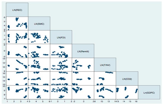 Numerous studies (e.g., [,]) have shown that international remittances can increase household income levels, which, in turn, may promote renewable energy consumption (REC). As remittances flow into households, they encourage families to invest in renewable energy plans. This financial support allows them to enhance their knowledge and skills related to renewable energy and implement green systems in their homes [].