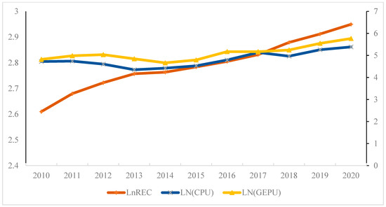 Figure 1 presents a scatterplot matrix illustrating the relationships among the determinants studied. Additionally, Figure 2 displays the time series data for REC, CPU, and GEPU within the BRICS countries from 2010 to 2020. As shown in Figure 2, there is a positive correlation between REC, CPU, and GEPU, suggesting that increases in CPU and GEPU lead to a rise in REC. Furthermore, Figure 2 indicates that REC showed a continuous increase throughout the study period, while CPU experienced a decline during the periods of 2010–2013 and 2017–2018.