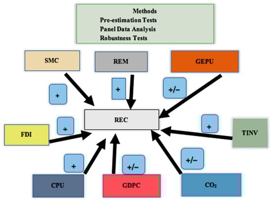 Furthermore, prior works have revealed that economic activity (e.g., [,]) and international remittances (e.g., [,]) promote REC by increasing the income level of investors and households. Additionally, past works have documented that CO2 [,] diminishes REC. Moreover, earlier studies (e.g., [,,]) have shown that green ecological strategies (EPs) promote REC by enhancing RE capacity growth. However, some works (e.g., [,]) have underscored how global economic policy uncertainty (GEPU) diminishes REC by decreasing investor and household income (demand side) [] and raising investment costs in the private sector [].