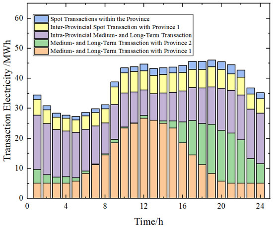 As can be seen in Figure 6, the GLA aggregators participating in the EE-PSMJ model’s medium- and long-term power purchase strategy purchase a large share of power from Province 1 in the MLTM, and the power purchase curves are very close to the preference curves of Province 1 generators. The preferences of the generators in Province 3 are conditionally satisfied based on the preference curves of the generators in Province 1. Medium- and long- term bilateral contracts with Province 2 are subject to the availability of surplus load. This is due to the fact that Province 1 is a power-exporting province with abundant renewable energy sources, with lower base prices for generators, and higher preference sensitivity coefficients for generators in Province 1 (as shown in Figure A1 in the Appendix A). This makes the generators more sensitive to the power purchase curve for medium- and long-term bilateral contracts, at which point, if the power purchase curve is sufficiently close to the generator’s preference curve, then the purchase price will be further reduced. Province 3 is an electricity-importing province with little renewable energy, and generators in Province 3 have medium-preference sensitivity coefficients and base prices compared to Provinces 1 and 2. Province 2 is an electricity-importing province with a low-preference sensitivity factor for generators and the highest base price. Province 2 is an electricity-importing province with a low-preference sensitivity factor for generators and the highest base price. Therefore, in order to ensure the lowest cost of power purchase, the GLA chooses to maximize the preference curve of the Province 1 generator and to try to satisfy the preference of the Province 3 generator, and the remaining load is contracted with the Province 2 generator for the medium- and long- term. In summary, the power purchase curves of the GLAs are consistent with the preference curves of lower-priced generators in terms of their medium- and long-term power purchase strategies.