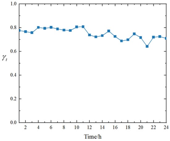 where denotes the column vector coefficients of the optimization objective of Equation (36); and are the optimization variables in the model, where the expression is Equation (38); , , , , and denote the coefficient matrices of the corresponding variables under the above constraints; and denote the constant column vectors. The constraints in line 1 represent the inequality constraints in the GLA purchase and sale of electricity model; the constraints in line 2 represent the equation constraints in the model; the constraints in line 3 represent constraints containing two optimization variables; the constraints in row 4 indicate the values taken by the forecasts of the PV and load in the deterministic optimization model of generation–load aggregation merchant purchase and sale of electricity, expressed in Equation (39) as follows: