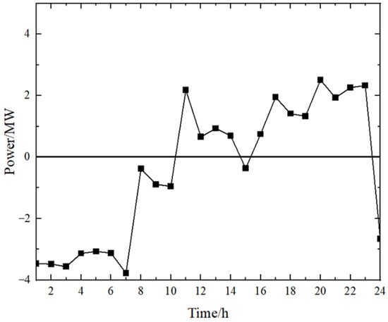 In this section, a two-stage robust optimization algorithm is used to solve Equation (45) so to obtain the GLAs participating in the electricity purchase and sale strategy of the EE-PSMJ model in the PSM, as shown in Figure 9. Among them, a power greater than zero means that the GLA supplies power to the PSM, and a power less than zero means that the GLA purchases power from the PSM. It can be seen from the figure that, in the PSM, in the period of low electricity prices (the PSM market tariffs are shown in Appendix A (Figure A2f)), the GLA purchases additional electric energy and transfers part of the transferable load in the period of high electricity prices at the cost of part of the profit so as to reduce the system operating costs. During peak tariff hours, the GLAs make a profit by selling electricity in the PSM. Among them, when the electricity price is high, at t = 15, the GLA buys electricity from the PSM, because there is a large gap between the predicted PV output curve and the actual PV output curve at t = 15, resulting in an insufficient power purchase by the GLA in the EEM. As can be seen in Figure 9, the GLAs are able to integrate the dispersed adjustable potential to form the much-needed scalable adjustable capacity of the power system to participate in the PSM. In summary, the participation of the GLAs in the PSM can reduce system operating costs, increase the profits, and enhance the regulatory capacity of the power system.
