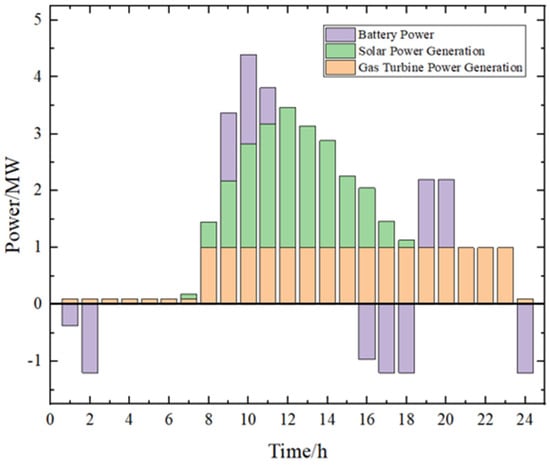 In this section, a two-stage robust optimization algorithm is used to solve Equation (30) so to obtain the generation and storage strategies for the electrical utilities aggregated by the GLA, as shown in Figure 10. At 7–12 h, the PV output monotonically increases, with the power going from 0 MW at 6 h to 2.83 MW at 12 h; the PV output monotonically decreases, with the power dropping to 0 MW from 12 h to 19 h. At 1~7 h and 19~24 h, the PV output is zero, and the load relies exclusively on power purchases from the external grid, energy storage, and self-provided generation. At this time, when the self-provided generation unit generation cost is higher than the pre-trading price of electricity in the EM, the self-provided generation operates with minimum output power, as shown at 1–7 h and 24 h; when the generation cost is lower than the pre-trading price of electricity in the EM, the self-provided generation outputs maximum power and reduces the purchased power to the external grid, as shown at 8 h, 12–22 h, and 24 h. Under the periodic condition of time-of-use electricity price mechanism and photovoltaic output, energy storage is charged when the electricity price is low or when the PV output is large, such as at 24–2 h and 16–18 h; the energy storage is discharged during peak tariff hours, such as from 9 to 11 h, and 19 h and 20 h. In summary, the generation storage strategy for electric utilities aggregated by the GLAs mentioned in this paper not only achieves lower operating costs, but also shaves the peaks and fills the valleys to a certain extent.