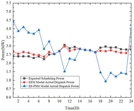 The electricity load strategies for the transferable loads aggregated by the GLAs are shown in Figure 11 and Figure 12. As shown in Figure 11, compared with the conventional load, the expected power consumption plan of the transferable load with the S-STDC in the EEM model and the EE-PSMJ model has little difference between the peak and valley values of the load, but it can still make the production plan again without affecting the production, and advance or delay part of the load. In the period of low electricity prices, the load with large power should be arranged as much as possible. For example, the part of electricity consumption power from 11 to 13 h should be transferred to 6–8 h, and the part of electricity consumption power from 18 to 23 h should be transferred to 24–5 h. As shown in Figure 12, the expected electricity consumption plan of the adjustment load is similar to that of the conventional load, and the electricity consumption is mainly concentrated in the peak period of electricity price. Under the premise of satisfying the balance of electricity consumption and the constant total electricity demand, the power of the load in the 1–10 h period is increased, and the power of the load in the 11–24 h period is reduced, so as to reduce the power that the system needs to purchase from the external grid in the peak price period. Among them, the transfer load capacity of the EE-PSMJ model is much larger than that of the EEM model, which is due to the participation of the power GLA in the PSM, which further reduces the electricity price in the peak period of electricity consumption, so that a greater transferable load in the peak period is transferred to the low period. In summary, the GLAs participating in the EE-PSMJ model can further exploit the adjustable characteristics of the transferable loads within it.