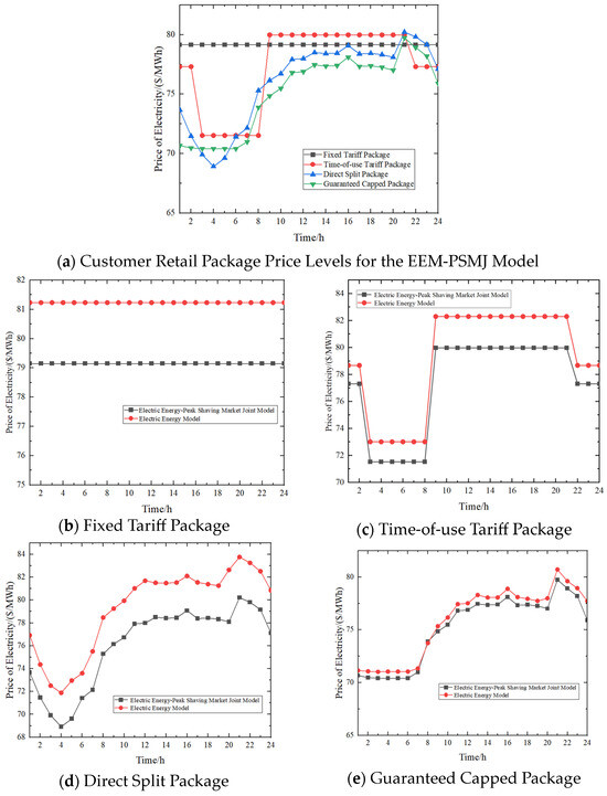 The role played by some of the constraints in the EE-PSMJ model can be seen in Figure 13a. Under the minimum customer utility constraint, if a retail package has a higher risk of electricity consumption costs or a lower comfort level, the GLA must increase the concession margin for changing the package in order to keep the customer utility greater than a certain threshold. The FTP does not carry the risk of electricity consumption costs and has a low impact on the load’s electricity consumption behavior, so it can be set at a higher tariff level. Although the P-VTUTP is also free from the risk of electricity consumption costs, the peaks and valleys of the tariff correspond to the peaks and valleys of the load, which have a greater impact on the load’s electricity consumption behavior, and therefore the tariff level needs to be slightly reduced to maintain the user’s utility. The peaks and valleys of the tariffs of the DSTP and GB-CTP also correspond to the peaks and valleys of the loads, and there is a certain amount of cost uncertainty, which necessitates a further reduction in the level of tariffs in order to maintain the utility of the adjustable resources. Figure 13b–e show the comparison of retail package prices when the GLA participates in the EE-PSMJ model and the control group EEM model. Among them, Figure 13b–d clearly show that the retail package price of the GLA participation in the EE-PSMJ model is lower than that of the EEM market model, with the retail package price being lower than 2 USD/MWh in most time periods, and even amounting to 5.54 USD/MWh in individual time periods. In Figure 13e, although there are individual time periods when the retail package prices for customers of the GLA participating in the EE-PSMJ model are higher than those of the EEM model, in general, it appears that the retail package prices for the GLA participating in the EE-PSMJ model are lower than those in the EEM market model. In summary, the GLA participating in the EE-PSMJ model is not only beneficial to the operators of the GLA, but also to the adjustable resources of the GLA aggregation due to the reduction in their electricity costs.