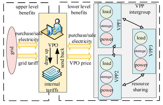 - Two-level structure to build the optimization methods for economic dispatch: the lower level focuses on the operational costs and environmental pollution costs of VPPs; the upper level establishes a game market framework between the VPO and the VPPs.