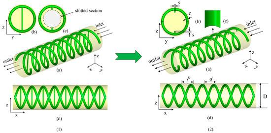 Schematic diagram of DSI: (a) 3D view of tube with DSI; (b) y–z view; (c) schematic diagram of slotted section; (d) x–z view.