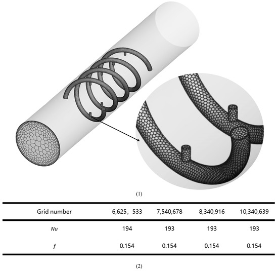 In the numerical simulation, we employed the Realizable k-ε turbulence model coupled with enhanced wall treatment, which is known for its superior performance in handling complex boundary layer flows characterized by rotation, separation, strong adverse pressure gradients, and recirculation. The pressure–velocity coupling was addressed using the SIMPLE algorithm, while the discretization of the momentum and energy equations was carried out with second-order accuracy for both pressure and up-wind schemes. The simulation was considered converged when the continuity equation reached a convergence criterion of 10−6, the momentum equation achieved the same level, and the energy equation settled at 10−8. Iterations were continued until the parameters of pressure gradient, outlet temperature, and outlet velocity exhibited negligible changes, indicating that the solution had stabilized according to the predefined convergence criteria. Notably, the surface for calculating the Nusselt number (Nu) was identified as the fluid–solid coupling surface of the heat exchange tube.
