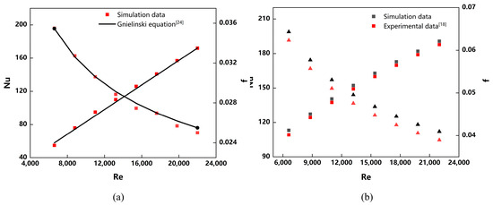 The numerical results for the smooth tube were compared with the empirical formula proposed by Gnielinski [4] and for the DSS [30] (Double Spiral Spring), and the simulation results were compared with the experimental data from Jafari, as shown in Figure 3. The comparison demonstrated minimal discrepancies between the simulation and experimental results, with the maximum error not exceeding 5.14% and the minimum error not falling lower than 3.56%, and relative errors maintained within ±6%. This confirms the applicability of the computational model utilized in this simulation.