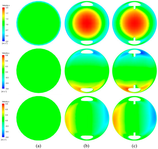 Figure 4 illustrates a comparative analysis of the velocity distributions at x = 755 mm for the smooth tubes, tubes with DSS, and tubes with DSI at a Reynolds number of 11,000. The analysis revealed that the presence of the insert in the tube significantly alters its velocity distribution compared to the smooth tube. Specifically, the velocity variation in the x-direction for the DSI tube is not significantly different from that of the DSS tube; however, notable changes are observed in the y-direction and z-direction velocities. This phenomenon indicates that the existence of keys within the DSI facilitates secondary flow in the tube, enhancing swirling effects and generating higher shear and radial velocities near the inner wall. The swirling effect accelerates the mixing between the main flow region and the near-wall region, thereby improving the tube’s heat exchange and flow characteristics.