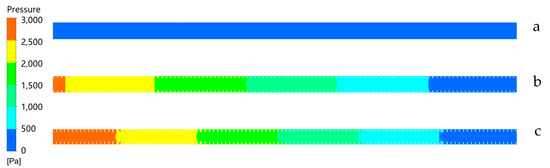 Pressure diagram of x–y plane longitudinal section. (a) Plain tube. (b) Tube with DSS inserted. (c) Tube with DSI inserted.