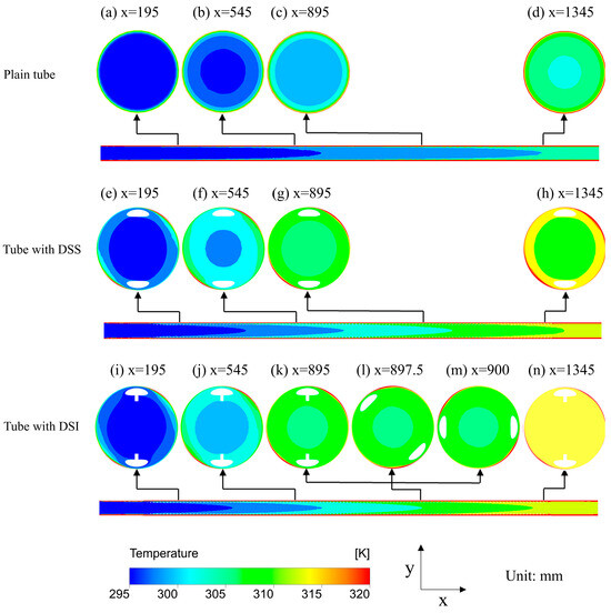 Figure 8 illustrates the temperature distribution differences among the smooth tube, the tube with DSS, and the tube with DSI. The temperature distribution in the smooth tube is relatively uniform, with smooth axial changes. In contrast, the tubes with inserts exhibit shorter low-temperature regions, indicating that the fluid experiences a more rapid temperature increase in these sections. The presence of the insert promotes heat exchange within the fluid, especially in regions of intense turbulence, resulting in more effective thermal interaction between the fluid and the tube wall. The DSI tube demonstrates superior heat transfer performance at all four investigated locations compared to the DSS tube. Furthermore, k-m illustrate the temperature distribution in the heat exchange tubes with DSI over half a pitch, displaying a periodic helical variation in high-temperature regions that confirms the positive heat transfer effects initiated by the DSI.