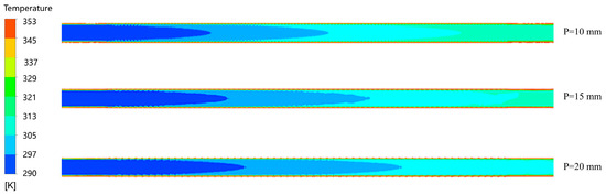 Under constant wall temperature conditions, Figure 9 presents the temperature distribution contours at z = 0 mm for DSI heat exchange tubes with three different pitches at Re = 11,000. The analysis indicates that with an increase in pitch, the low-temperature region within the heat exchange tube enlarges, while the outlet temperature exhibits a decreasing trend. This phenomenon can be explained by the fact that an increase in pitch results in a larger spacing between adjacent turns, thereby diminishing disruption and guidance effects on the fluid; moreover, an increased pitch also reduces the effective heat exchange area. These two factors collectively lead to a decrease in overall heat exchange, affecting the outlet temperature.