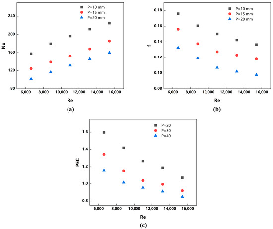 Variation in (a) Nusselt number, (b) friction factor, and (c) PEC, in terms of various pitches.